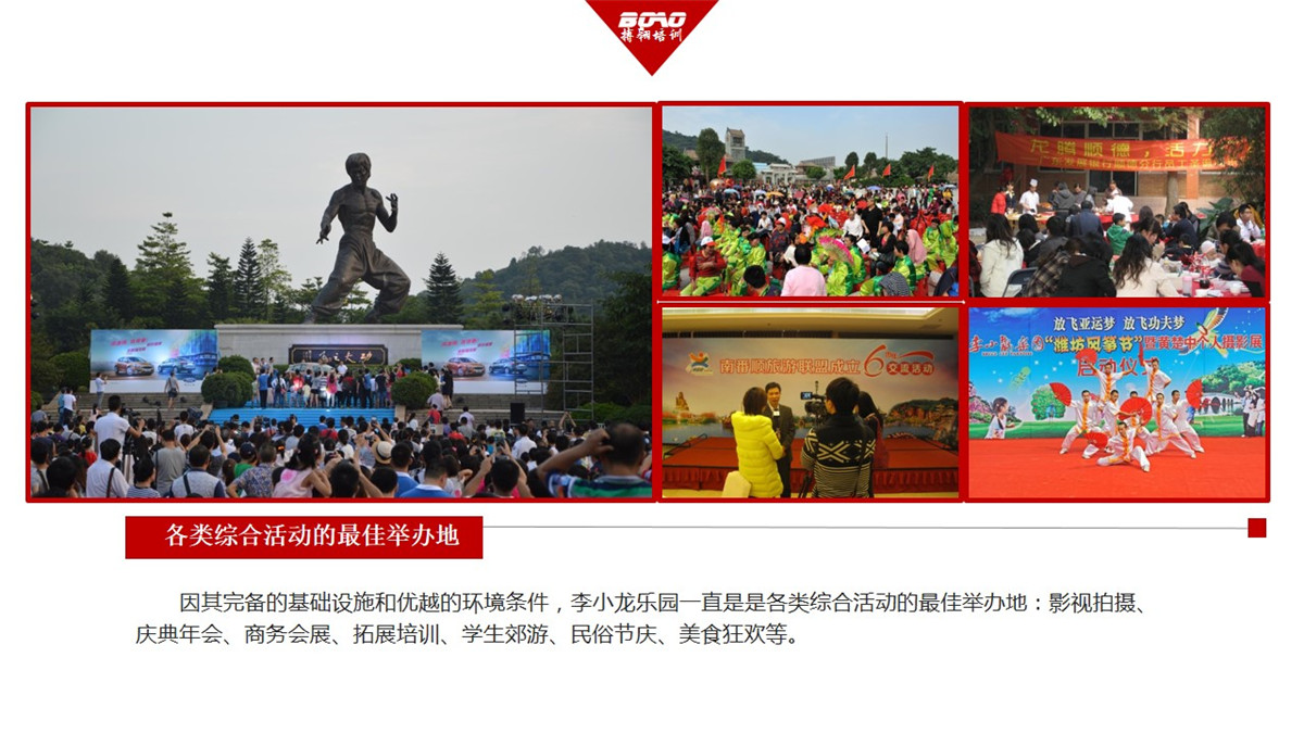 因其完備的基礎設施和優(yōu)越的環(huán)境條件,李小龍樂園一直是是各類綜合活動的最佳舉辦地:影視拍攝、慶典年會、商務會展、拓展培訓、學生郊游、民俗節(jié)慶、美食狂歡等。